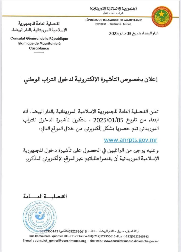 وأشارت إلى أن تقديم طلبات التأشيرة أصبح متاحًا حصريًا عبر الموقع الرسمي للوكالة الوطنية لسجل السكان والملكية الآمنة (https://anrpts.gov.mr)، مما يلغي الحاجة إلى زيارة السفارات والقنصليات للحصول على التأشيرة.