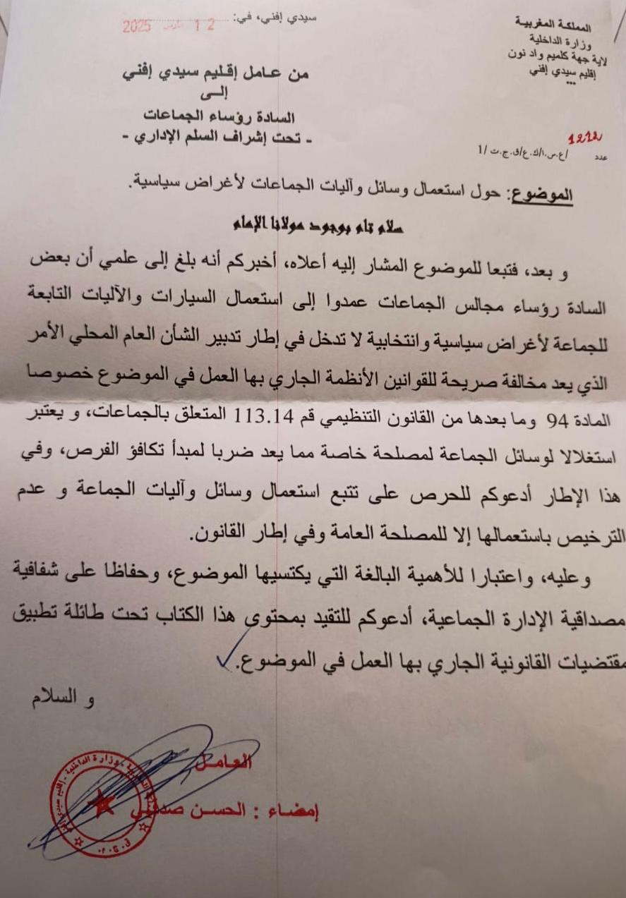 أصدرت وزارة الداخلية ممثلة في عامل إقليم سيدي إفني، حسن صدقي، مراسلة إلى رؤساء الجماعات بالإقليم، تدعوهم إلى عدم استخدام وسائل وآليات الجماعات لأغراض سياسية أو انتخابية.