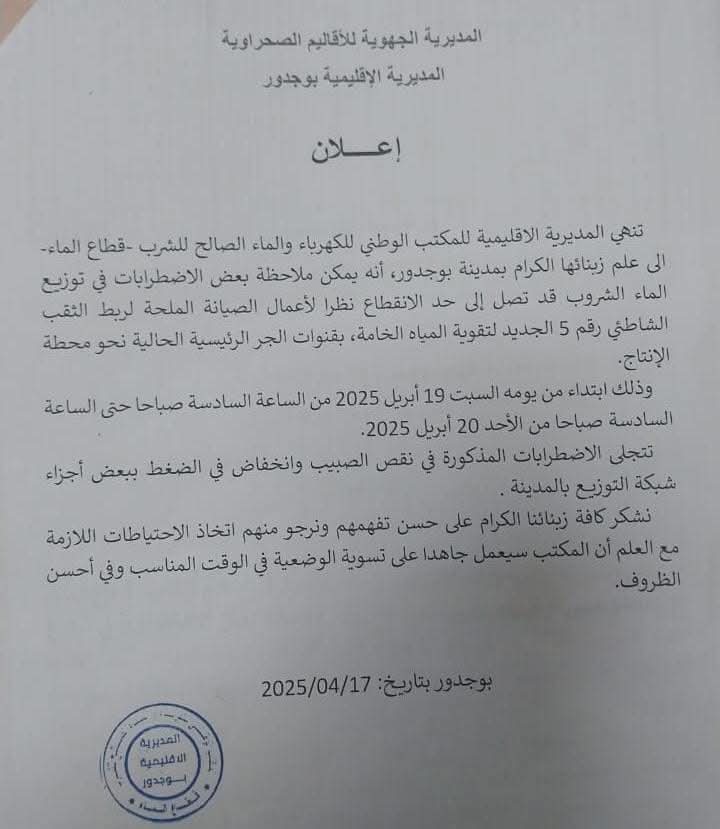 أعلنت المديرية الإقليمية للمكتب الوطني للكهرباء والماء الصالح للشرب – قطاع الماء ببوجدور، عن تسجيل اضطرابات وانقطاعات محتملة في توزيع الماء الشروب بعدد من مناطق المدينة، وذلك ابتداءً من يوم السبت 19 أبريل 2025 على الساعة السادسة صباحاً، وإلى غاية صباح يوم الأحد 20 أبريل 2025.