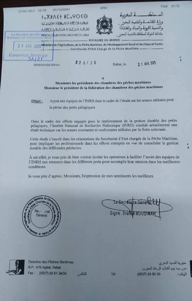 وجهت كتابة الدولة المكلفة بالصيد البحري مراسلة رسمية بتاريخ 21 أبريل الجاري، إلى رؤساء غرف الصيد البحري ورئيس فدرالية الغرف، تدعو فيها إلى تسهيل مهمة الفرق الميدانية التابعة للمعهد الوطني للبحث في الصيد البحري (INRH) خلال دراستها حول الشباك المستعملة في صيد الأسماك السطحية الصغيرة.