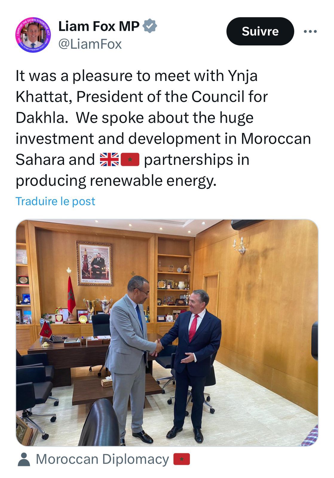 ويعد ليام فوكس من أبرز الأصوات السياسية داخل حزب المحافظين البريطاني الداعمة لمغربية الصحراء، حيث سبق له أن تقلد مناصب وزارية مهمة، من بينها وزارة الدفاع ووزارة التجارة الدولية، كما شغل رئاسة حزب المحافظين بين سنتي 2003 و2005.