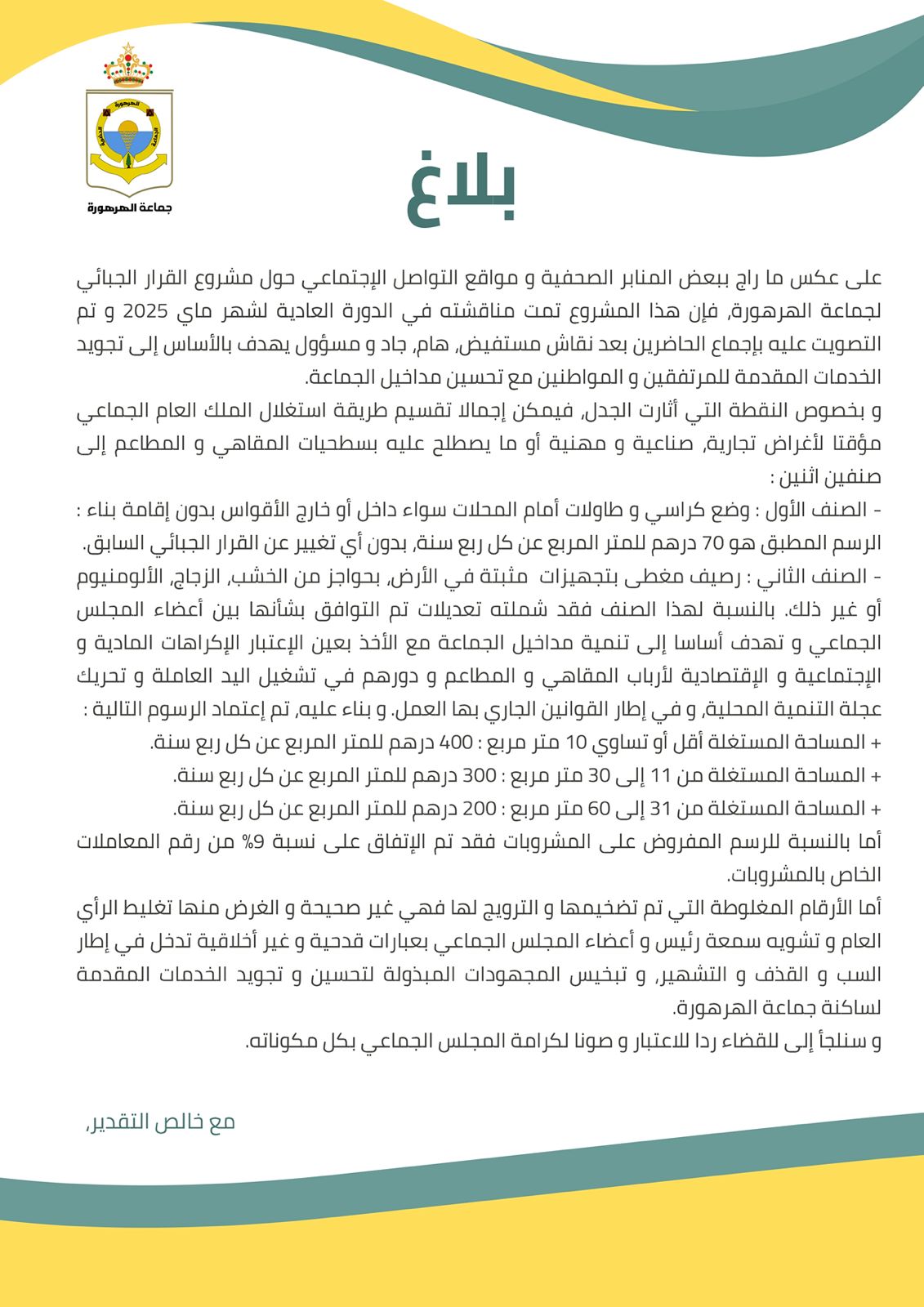 في بلاغ رسمي، نفت جماعة المهرهورة صحة ما تم تداوله في بعض وسائل الإعلام ومنصات التواصل الاجتماعي حول مشروع القرار الجبائي الجديد، مؤكدة أن المشروع تم طرحه ومناقشته خلال الدورة العادية لشهر ماي 2025، وصُوّت عليه بالإجماع بعد نقاش مستفيض بين الأعضاء.