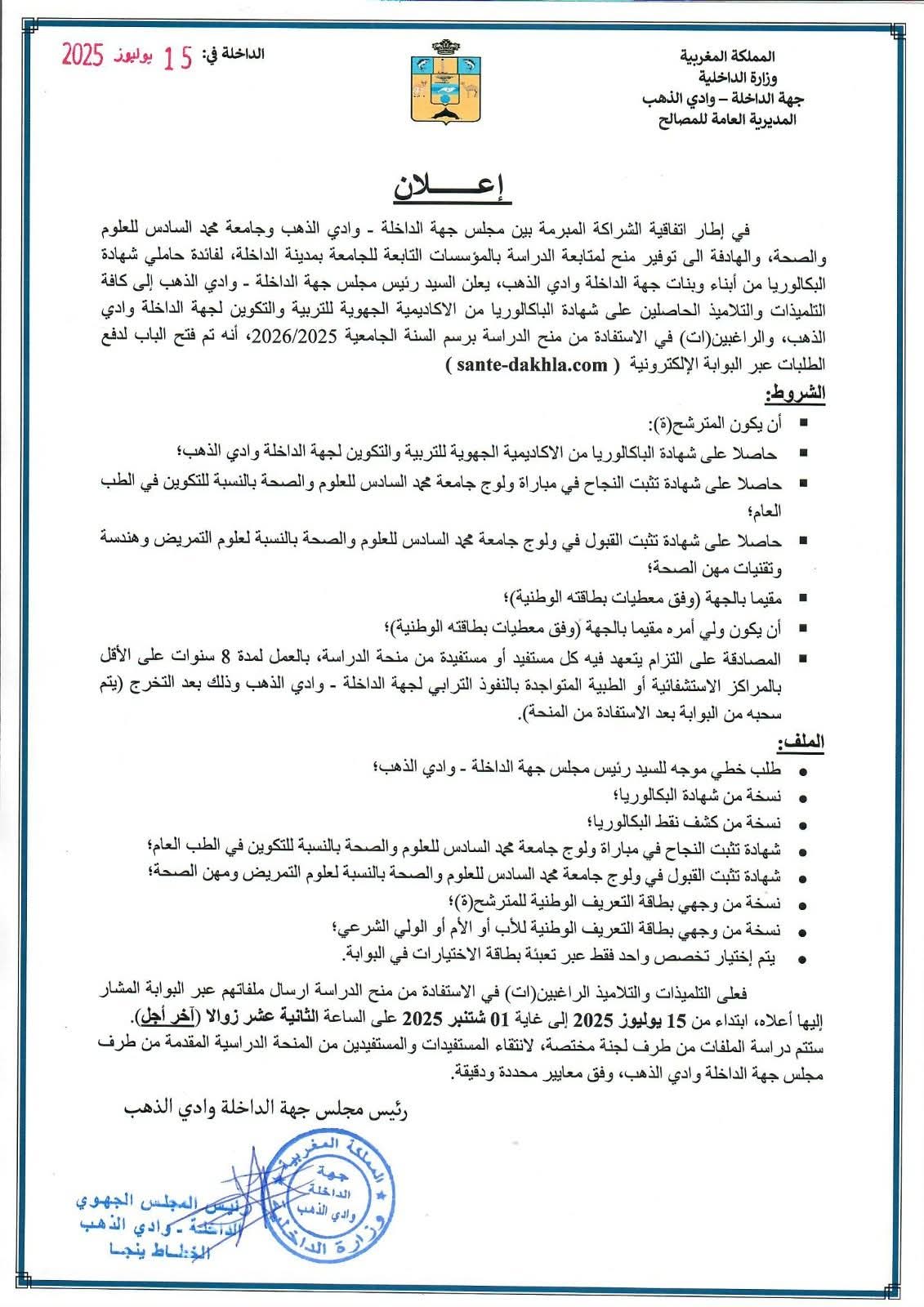 في إطار سعيه المتواصل للاستجابة الفعلية لتطلعات ساكنة الجهة، أعلن مجلس جهة الداخلة – وادي الذهب عن فتح باب إيداع الطلبات للاستفادة من منح دراسية لفائدة الطالبات والطلبة بجامعة محمد السادس للعلوم والصحة، برسم الموسم الجامعي 2025-2026، وذلك عبر البوابة الإلكترونية المخصصة: sante-dakhla.com.