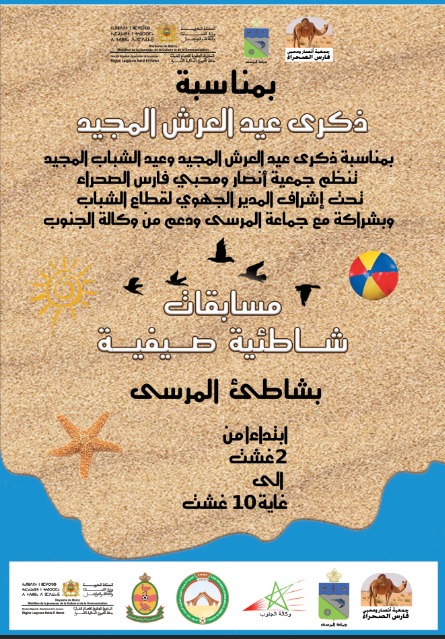 في أجواء مفعمة بالحيوية وروح الانتماء الوطني، وتزامناً مع الاحتفالات المخلدة للذكرى السادسة والعشرين لعيد العرش المجيد، تحتضن جماعة المرسى جنوب المملكة المغربية حدثاً رياضياً فريداً من نوعه، يتمثل في تنظيم ألعاب شاطئية صيفية وسط الرمال الذهبية لشاطئ المدينة.