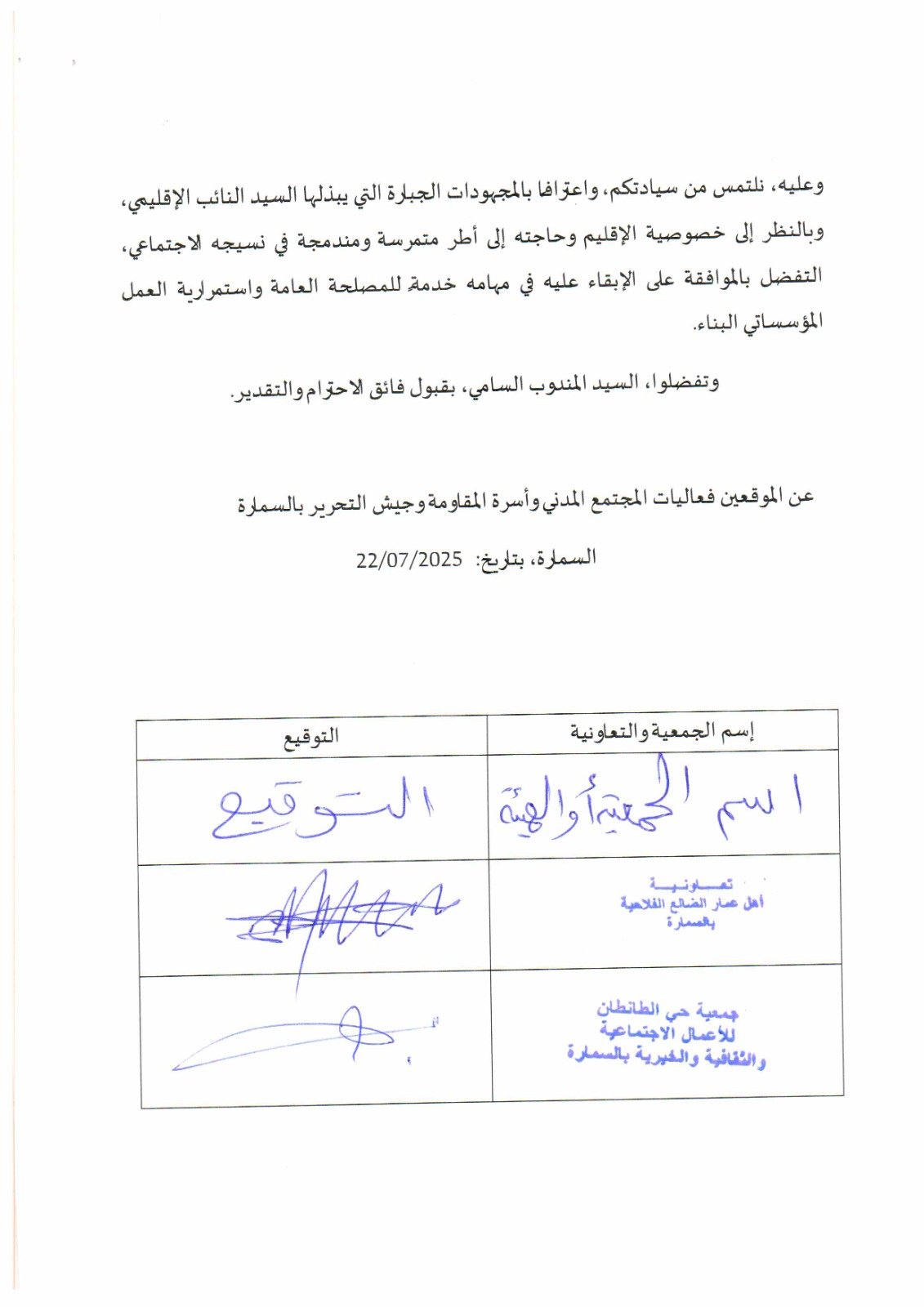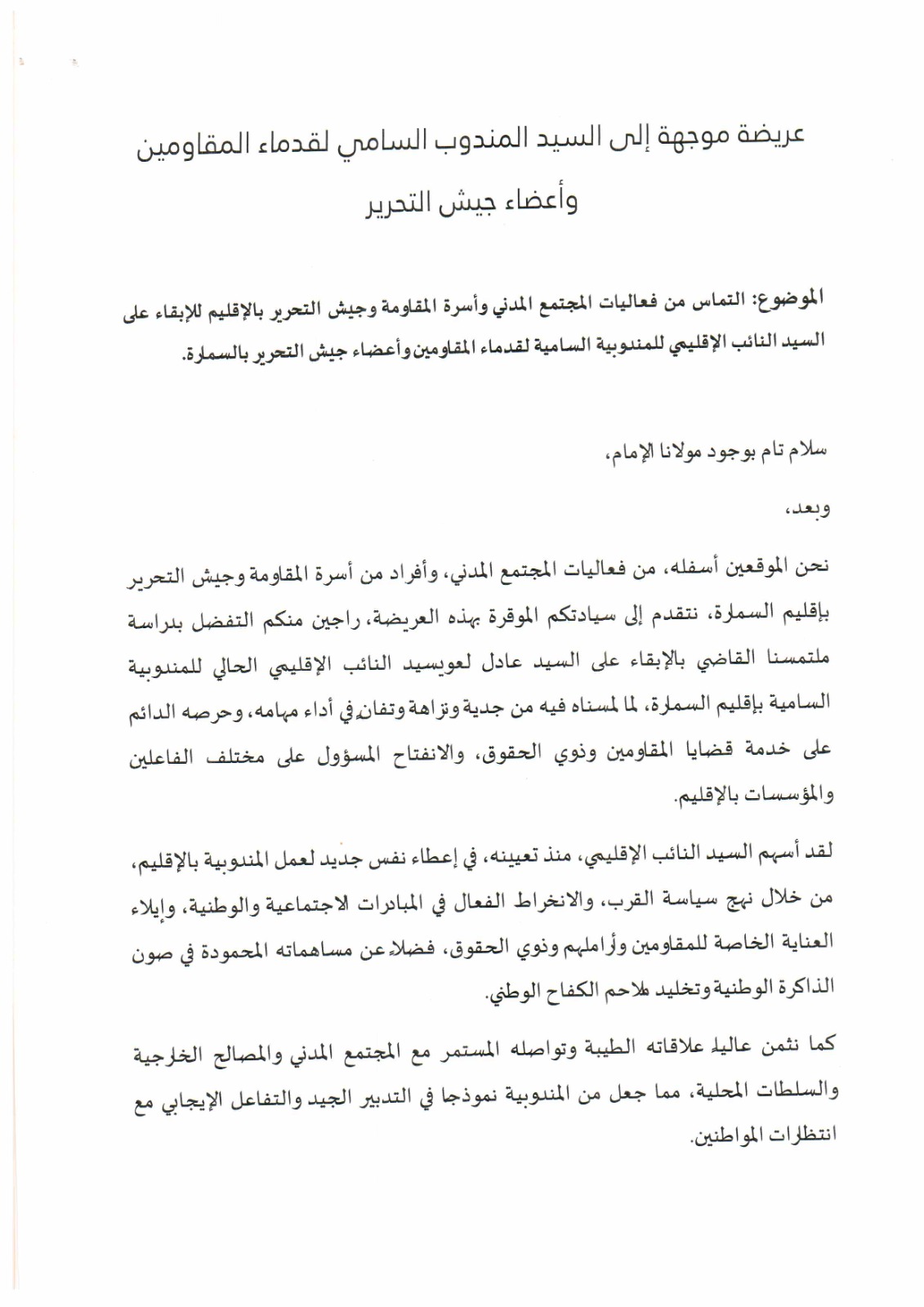في خطوة تعبّر عن روح التقدير والاعتراف بالكفاءة، وجّهت فعاليات من المجتمع المدني وعدد من أفراد أسرة المقاومة وجيش التحرير بإقليم السمارة عريضة إلى السيد المندوب السامي لقدماء المقاومين وأعضاء جيش التحرير، التمسوا من خلالها الإبقاء على السيد عادل لعويسيد في منصبه كنائب إقليمي للمندوبية السامية بالإقليم.