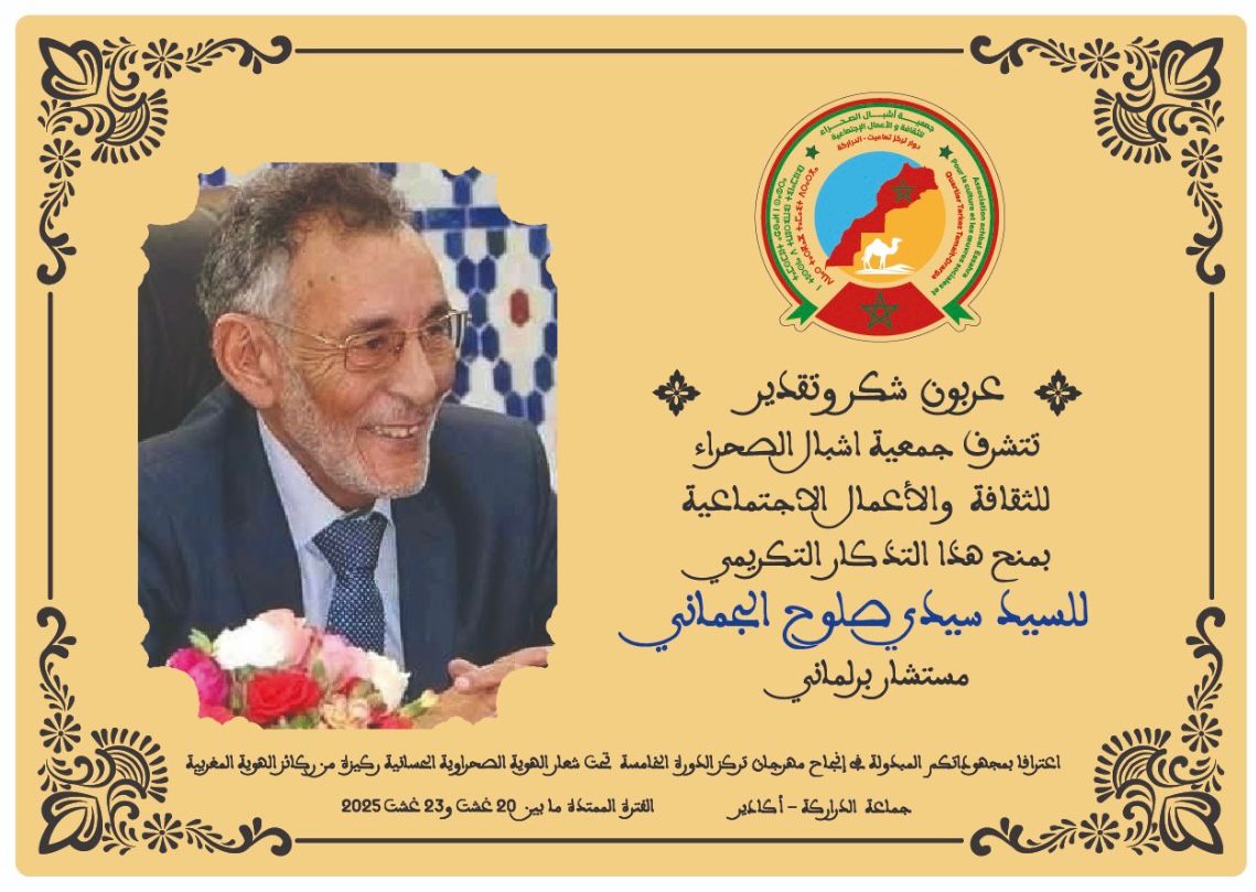 وأكد أعضاء الجمعية أن المستشار البرلماني ظل حاضراً في مختلف المحطات، داعماً للمبادرات الثقافية والاجتماعية الهادفة إلى إبراز الموروث المحلي وصون الهوية الصحراوية، وهو ما جعلهم حريصين على التعبير عن امتنانهم لشخصه.