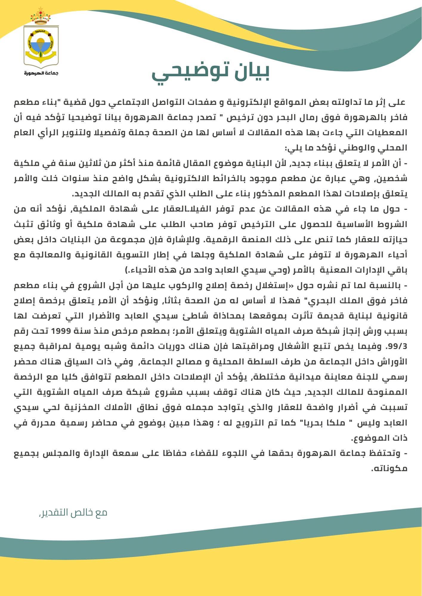 أصدرت جماعة الهرهورة بيانًا توضيحيًا ردًا على ما تم تداوله ببعض المنابر الإعلامية وصفحات التواصل الاجتماعي بخصوص “بناء مطعم فاخر فوق رمال البحر دون ترخيص”.