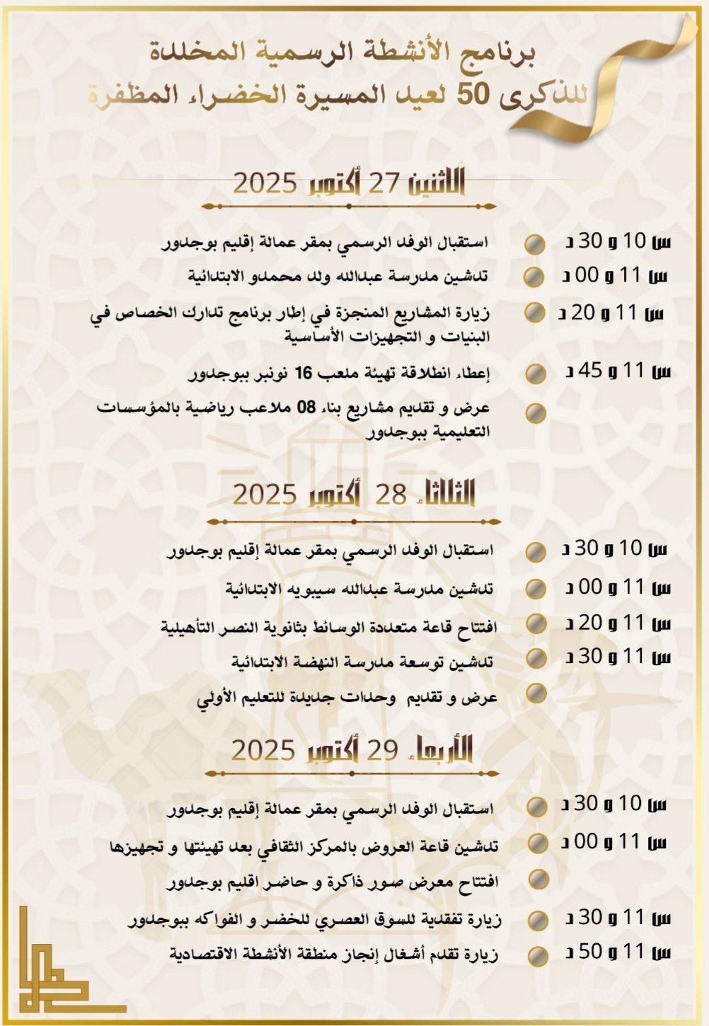 كما لعبت الفعاليات المنتخبة والمجتمع المدني دورًا مهمًا في تعزيز روح الانتماء والعمل الجماعي، حيث توحدت الجهود بين السلطات المحلية والأمنية والمجتمع المدني لتنظيم أنشطة ثقافية ورياضية ومهرجانات وندوات، احتفاءً بالذكرى الخمسين.