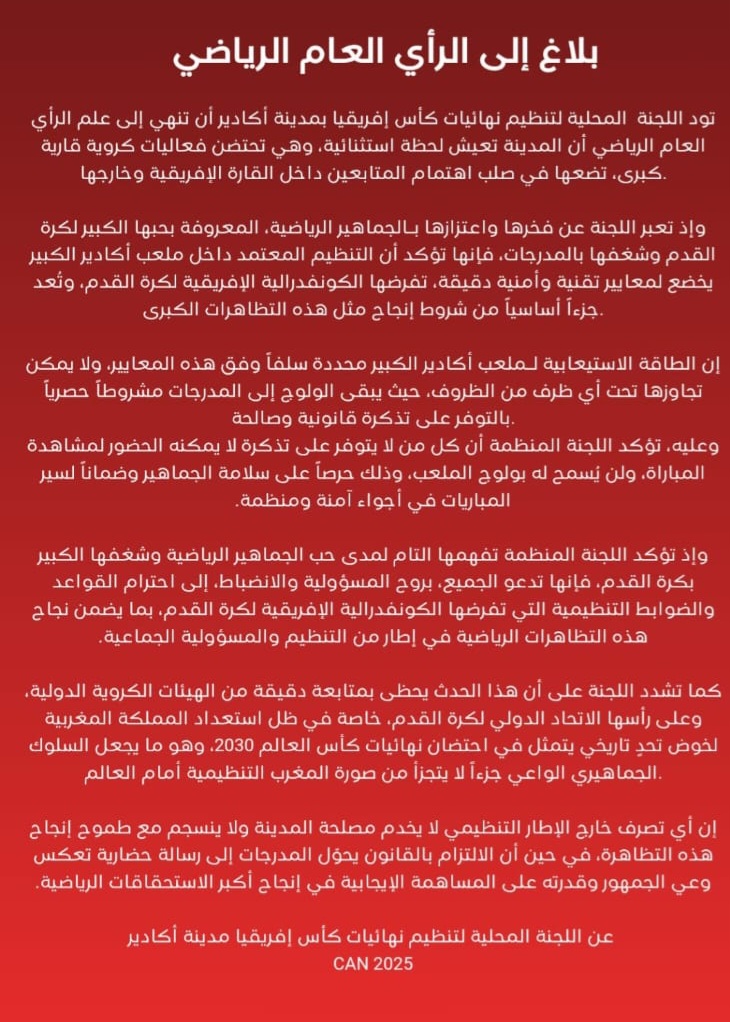 وأعربت اللجنة عن اعتزازها الكبير بالجماهير الرياضية وشغفها المعروف بكرة القدم، مشددة في المقابل على أن التنظيم المعتمد داخل ملعب أكادير الكبير يخضع لمعايير تقنية وأمنية صارمة تفرضها الكونفدرالية الإفريقية لكرة القدم، وتُعد جزءاً أساسياً من شروط إنجاح هذه التظاهرات الكبرى.