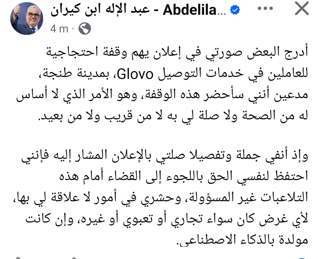 نفى عبد الإله بنكيران الأمين العام لحزب العدالة والتنمية بشكل قاطع أي علاقة له بإعلان متداول على مواقع التواصل الاجتماعي يروّج لمشاركته في وقفة احتجاجية لعمّال خدمات التوصيل التابعة لشركة “Glovo” بمدينة طنجة.